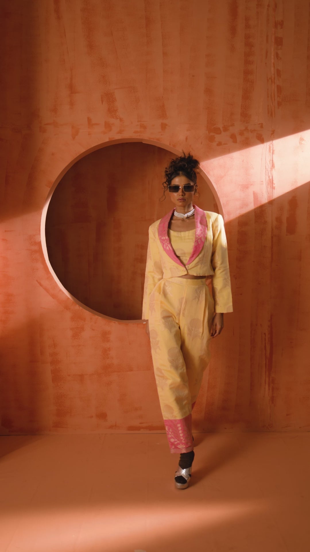 Step into the spotlight with this stunning 3-piece coordinated set, a perfect blend of modern chic and timeless elegance. Made from luxurious fabric with a subtle sheen, this set is designed to make a statement at any occasion. The ensemble features a crop top, high-waisted trousers, and a tailored jacket, all in a radiant yellow hue with delicate pink accents that add a touch of playful sophistication.
