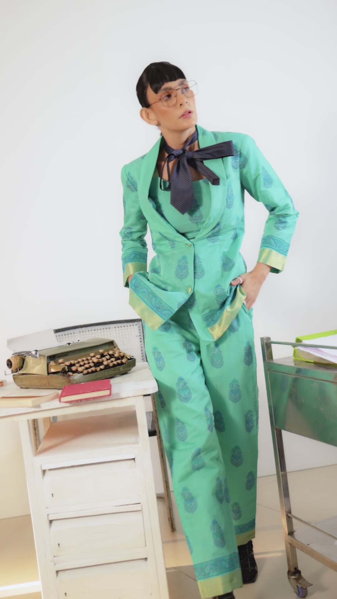 Trousers: The high-waisted trousers complete the ensemble with a sleek, straight-leg cut that elongates the legs. Lined with pure cotton, these trousers ensure breathability and comfort, making them suitable for all-day wear. The subtle shimmer in the fabric adds a touch of glamour, making these trousers perfect for both day and night events.