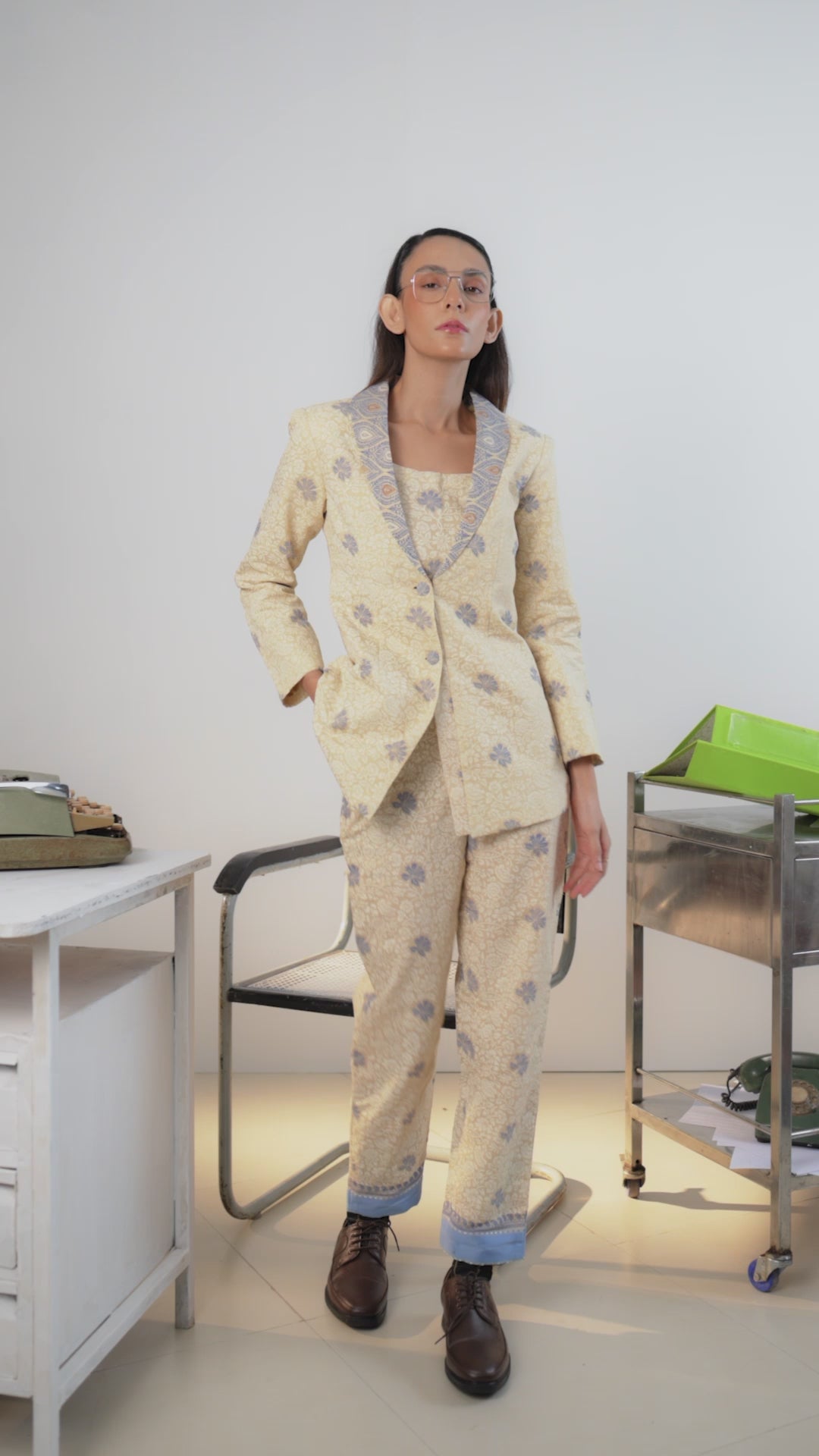Crafted with comfort in mind, this pant suit set features a satin lining in the jacket that feels smooth against the skin, ensuring you stay comfortable throughout the day. The shoulder pads provide structure and a flattering shape, while the cotton-lined trousers offer breathability and ease of movement. The unique design, with its blend of traditional fabric and modern tailoring, makes this set a standout piece that exudes elegance and style.